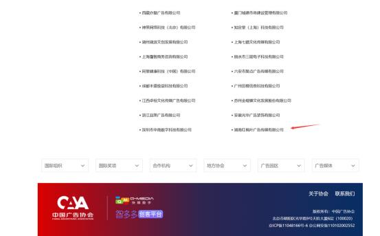 3月1日,經(jīng)中國廣告協(xié)會(huì)審核,國家高新技術(shù)企業(yè)湖南紅楓葉廣告?zhèn)髅接邢薰菊酵ㄟ^中國廣告協(xié)會(huì)資質(zhì)認(rèn)證,并獲得《中國廣告協(xié)會(huì)會(huì)員證書》,及中國廣告協(xié)會(huì)官方網(wǎng)站,會(huì)員單位名錄的收錄。